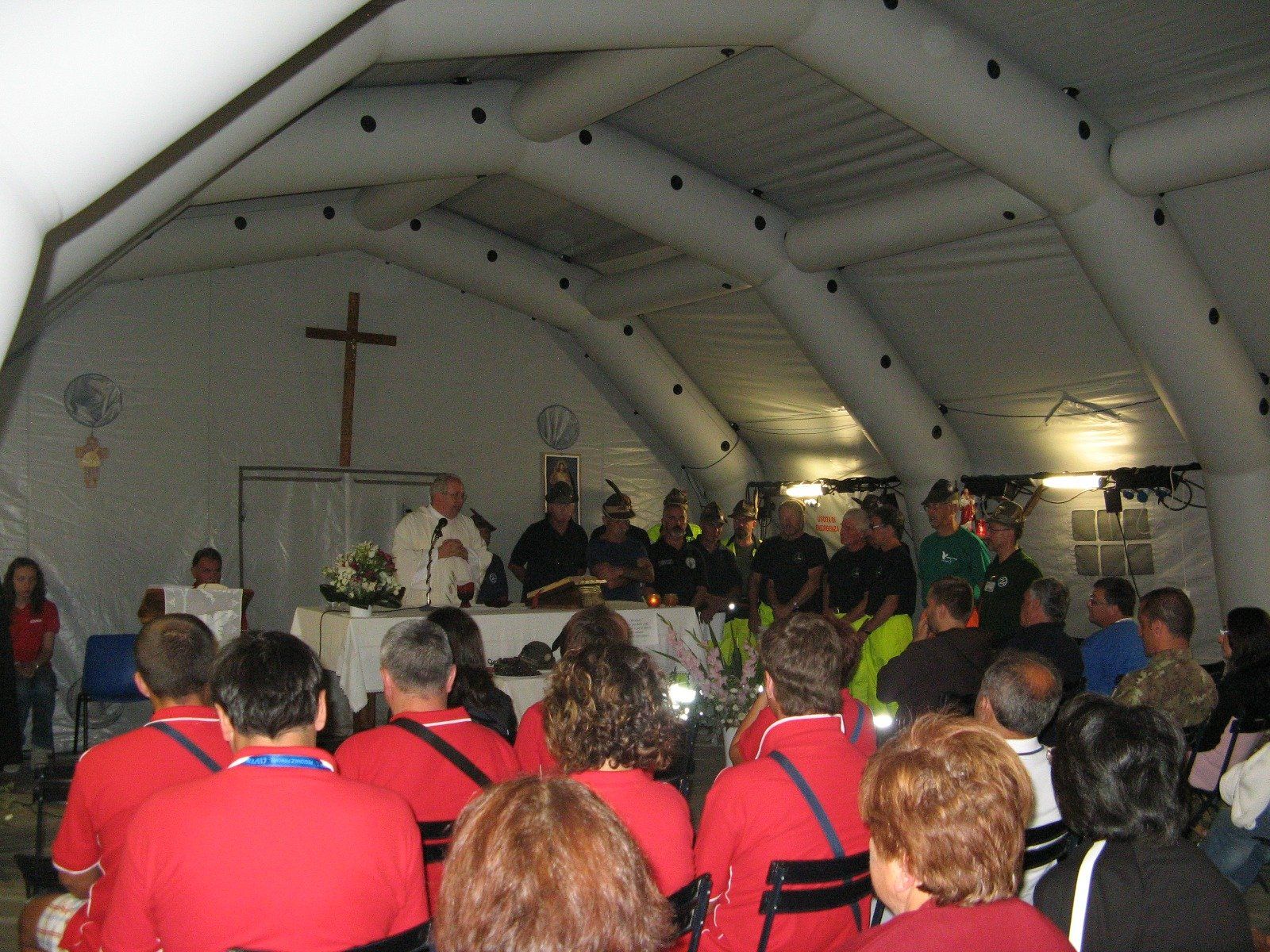 Raggiungiamo quindi il Campo Base allestito presso il centro commerciale “Globo” di Teramo e, purtroppo, a causa di inconvenienti logistici della segreteria locale, dobbiamo attendere un po’ prima che ci venga assegnata la tenda. Nel frattempo, formiamo i gruppi di lavoro a seconda delle competenze del singolo volontario: il nostro gruppo viene destinato ad interventi di falegnameria, di sicurezza, di ordine pubblico, da elettricista e da addetto al magazzino. Nel campo sono presenti quasi un migliaio di residenti e circa 300 tra militari e volontari di varie associazioni (ANA, ASL, AVIS, ecc) che offrono servizi di prima necessità, tra cui mensa, infermeria, pronto soccorso, centro ricreativo e spazio bimbi con parco giochi. Lo sbalzo termico si fa sentire durante la notte: essendo a 700 metri d’altitudine, dormiamo volentieri sotto le coperte! Domenica mattina veniamo a conoscenza che, nella notte, il campo ha ricevuto due visite indesiderate: una lieve scossa di terremoto e sciacalli tra i container. Un ufficiale della Guardia di Finanza decide quindi di istituire un servizio di pattugliamento continuo eseguito dalle forze dell’ordine presenti nel campo, supportate dai carabinieri locali. In questi primi giorni abbiamo l’opportunità di approfondire i disagi dei residenti, che da mesi vivono in tenda insieme a degli sconosciuti, privati di ogni forma di privacy, ma con la speranza di ritornare nella loro amata città.