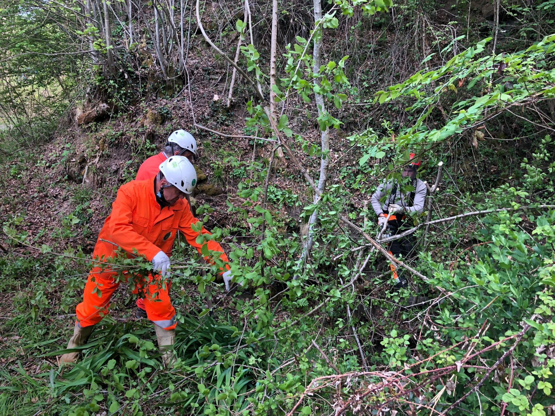 Iniziamo con i decespugliatori, facendo da apripista, pulendo la riva del torrente dalle numerose erbacce, lasciando spazio per il taglio delle piante eseguito dagli altri gruppi. Questa fruttuosa collaborazione ci ha dato modo di vedere come lavorano gli altri gruppi.