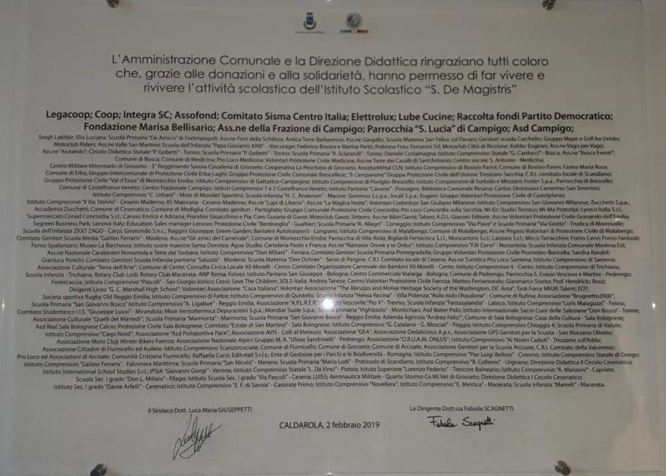 L’inaugurazione si è tenuta il 2 febbraio, con la partecipazione del nostro capogruppo Franco Carminati, di alcuni Consiglieri alpini, del Sindaco di Pedrengo Gabriele Gabbiadini e di alcuni assessori. La cerimonia si è svolta in un clima festoso, con i bambini protagonisti assoluti, davanti ad una nutrita platea di autorità, tra cui il Presidente del Parlamento Europeo Antonio Tajani e il Sindaco di Caldarola Luca Giuseppetti. Si tratta del primo passo verso una ricostruzione che, seppur lenta, dà speranza alla popolazione.